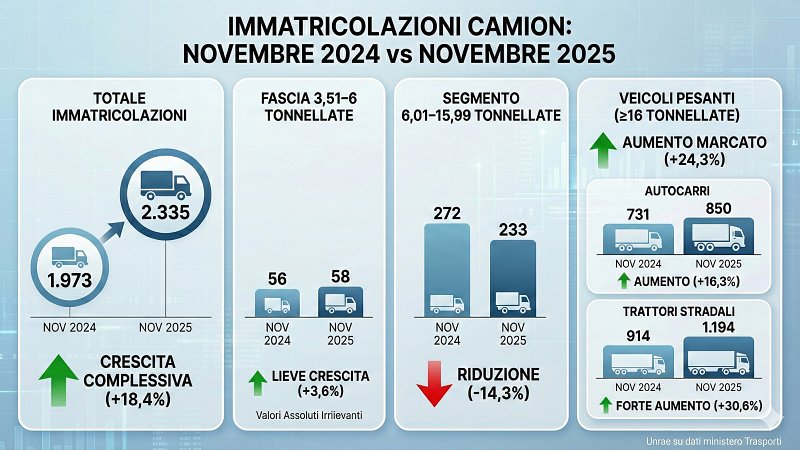 Ad aprile 2024 le immatricolazioni italiane di veicoli industriali con massa complessiva superiore a 3,5 tonnellate mostrano un aumento a doppia cifra rispetto al mese precedente, dopo un marzo in rosso. Unrae comunica che la Motorizzazione ha immatricolato 2.340 unità. Ma l’andamento varia secondo la categoria di peso. Le migliori prestazioni vengono dalla fascia più leggera, quella sopra le 16 tonnellate, che ad aprile è cresciuta di ben il 22,8%. Il segmento intermedio (da 3,51 a 6 tonnellate) mostra una crescita leggera (2%), mentre la gamma intermedia (da 6,1 a 16 tonnellate) resta in rosso (-2,8%). Considerando il primo quadrimestre, l’intero settore ha immatricolato 10.168 unità, con un aumento dell’8,5% rispetto allo stesso periodo del 2023.