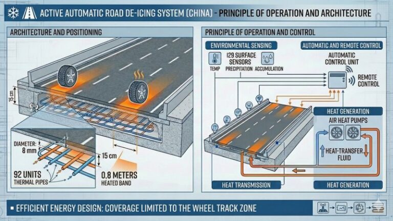 The operating principle is based on a circuit using a heat-transfer fluid warmed by air-source heat pumps. When conditions favour snow and ice formation, the system brings the fluid to a temperature between 50 and 60 degrees Celsius and circulates it through the buried pipes. Heat is transferred by conduction through the pavement layers to the surface, where control logic seeks to keep the heated strip at around one to two degrees above zero. Operating in this range prevents surface moisture from freezing and initiates snow melt on contact, while limiting energy consumption and thermal stress on the asphalt layers. The system is designed to melt up to 20 centimetres of snow in about five hours of continuous operation. During very heavy snowfall, it is intended to work in combination with mechanical equipment, preventing refreezing and making removal more effective.
