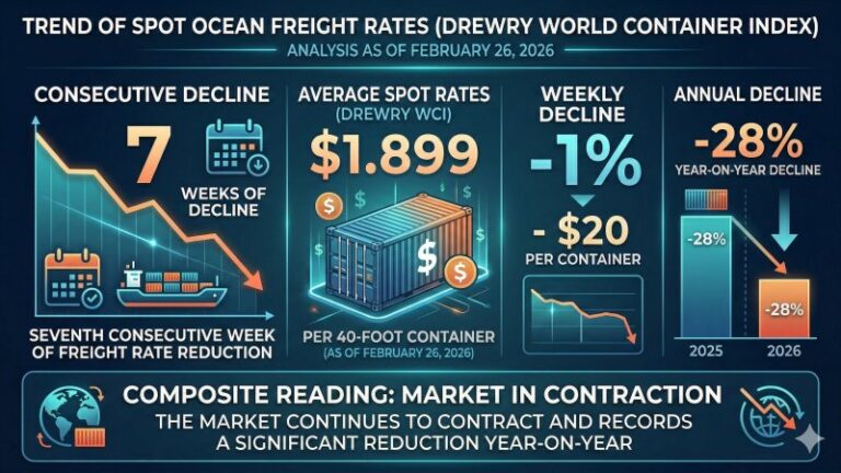 Average spot container shipping rates, as measured by the Drewry World Container Index, continued their downward trend for the seventh consecutive week, reaching 1,899 dollars per 40ft container on 26 February 2026, down 1 per cent week on week, or 20 dollars. The composite reading points to a market that is still contracting and, on an annual basis, shows a 28 per cent reduction. The data confirm that the rebalancing between demand and vessel capacity remains incomplete, with rates well below levels seen twelve months ago.