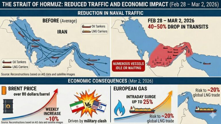 - Traffic of oil tankers and LNG carriers in the Strait of Hormuz was sharply reduced between 28 February and 2 March 2026, with transits down by 40–50% and numerous vessels stationary or waiting in the Persian Gulf, according to reconstructions based on AIS data and satellite imagery.