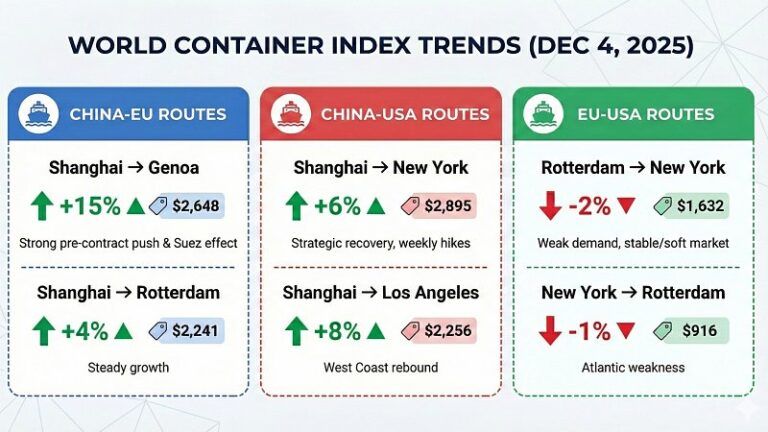 Routes between China and the European Union show the most pronounced increases. The Shanghai–Genoa corridor reaches 2,648 dollars, a 15 per cent rise and an absolute increase of 348 dollars, around 323 euros. On an annual basis the decline remains steep at 52 per cent. The Shanghai–Rotterdam route rises by 4 per cent to 2,241 dollars, a 53 per cent drop compared with the same period last year. The rebound is more modest on the return leg, Rotterdam–Shanghai, which climbs by 2 per cent to 460 dollars, while the year-on-year comparison shows an 11 per cent fall.