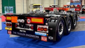 The Flex-XL showcased in Piacenza is one of the flagship models of Pacton's Container X series. It features a telescopic mechanical frame, which provides maximum flexibility for transporting any combination of ISO containers and swap bodies. The vehicle's tare weight ranges from 5,150 to 5,500 kilograms, depending on the chosen accessories, ensuring a balance between lightness and robustness. The advanced design and use of high-quality steel guarantee stability and durability—essential characteristics for transporting heavy loads.