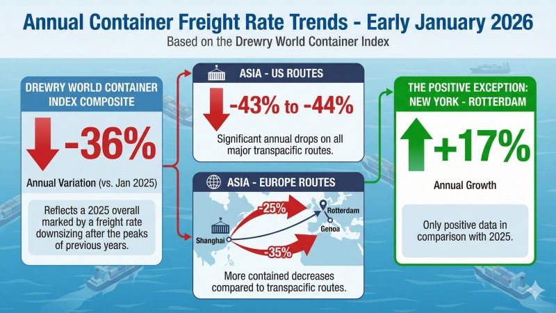 While the weekly analysis highlights a sharp rebound at the start of 2026, the year-on-year comparison paints a different picture. The composite Drewry World Container Index is 36% lower than in the same period a year earlier, reflecting a 2025 overall marked by a scaling back of freight rates after the peaks of previous years. The main Asia–United States routes show annual declines of between 43% and 44%, while the Asia–Europe lanes record more limited drops, such as -25% on Shanghai–Genoa and -35% on Shanghai–Rotterdam. An exception is the New York–Rotterdam route, which on an annual basis shows growth of 17%, the only positive figure in comparison with 2025.