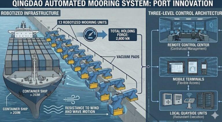 From a technical perspective, the infrastructure installed at Qingdao consists of 13 robotic mooring units equipped with vacuum pads. The simultaneous activation of the units generates a total holding force of 2,600 kilonewtons, considered sufficient to keep container ships over 200 metres in position even in windy conditions and heavy swell. The system is governed by a three-level control architecture integrating a remote control centre, mobile terminals and local units installed on the quay, enabling centralised and redundant management.