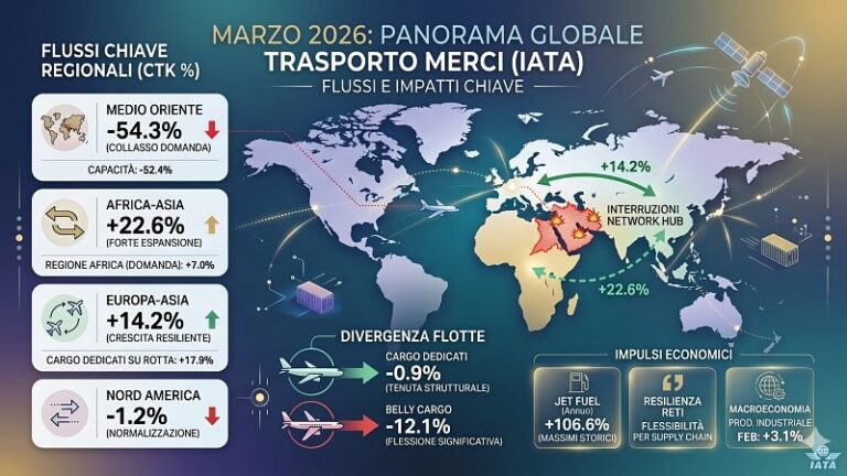 La Iata ha diffuso le rilevazioni sul trasporto aereo mondiale delle merci a marzo 2026, rilevando una contrazione della domanda del 4,8% su base annua in termini di tonnellate-chilometro, valore che sale al 5,5% per le sole operazioni internazionali. La capacità, misurata in tonnellate-chilometro disponibili, si è ridotta del 4,7% a livello globale e del 6,8% per i voli internazionali. Al centro di questa flessione si trova la crisi in corso nel Medio Oriente, che ha di fatto paralizzato alcuni tra i principali scali di smistamento del cargo mondiale, alterando i flussi su scala globale e costringendo le compagnie aeree a riconfigurare le proprie reti operative.