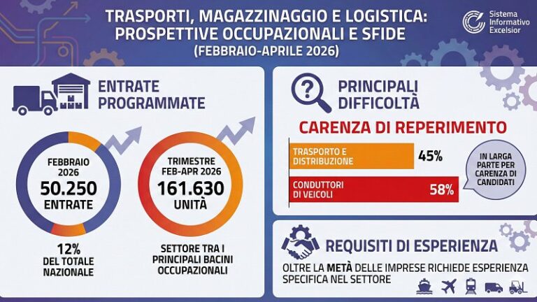 Nel mercato del lavoro italiano di febbraio 2026, il comparto di trasporto, magazzinaggio e logistica si conferma uno degli assi portanti della domanda di personale. Secondo il Sistema informativo Excelsior, le imprese del settore programmano 50.250 entrate nel solo mese di febbraio, pari al 12% del totale nazionale. La proiezione per il trimestre febbraio-aprile sale a 161.630 unità, segnalando una continuità della domanda lungo l’intera catena distributiva.