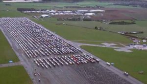 Il Governo sta cercando una soluzione aprendo alla sosta dei veicoli industriali l’aeroporto di Manston, (nella foto aerea di Sky) anche se probabilmente non sarà sufficiente per tutti i veicoli. Secondo il ministro degli Interni britannico, Priti Patel, nell’aeroporto ci sono già 870 veicoli industriali, ma altri 650 sono ancora bloccati lungo l’autostrada M20 sono bloccati altri 650 camion.