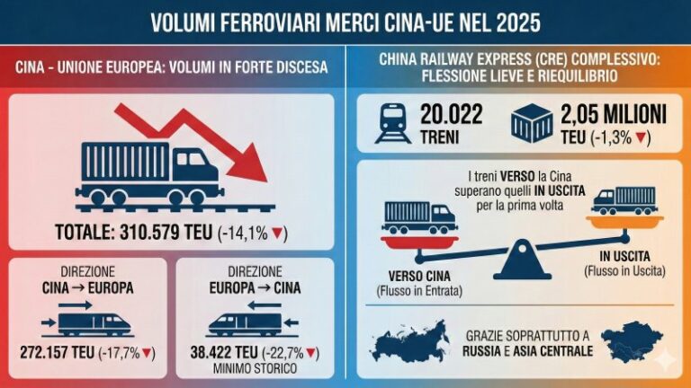 - Nel 2025 i volumi ferroviari merci tra Cina e Unione Europea sono scesi a 310.579 teu, -14,1%, con un calo più marcato sia in direzione Cina-Europa, -17,7% a 272.157 teu, sia nel ritorno Europa-Cina, -22,7% a 38.422 teu, minimo storico.