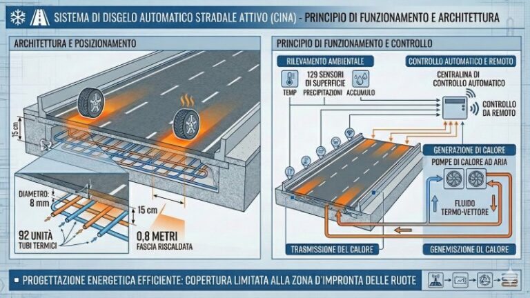 Il principio di funzionamento si basa su un circuito con fluido termo-vettore riscaldato da pompe di calore ad aria. In presenza di condizioni favorevoli alla formazione di neve e ghiaccio, il sistema porta il fluido a una temperatura compresa tra 50 e 60 gradi e lo fa circolare nei tubi interrati. Il calore si trasmette per conduzione attraverso gli strati della pavimentazione fino alla superficie, dove il controllo punta a mantenere la temperatura della fascia riscaldata intorno a 1-2 gradi sopra lo zero. Operare su questo intervallo consente di evitare il congelamento dell’umidità superficiale e di innescare lo scioglimento della neve al contatto, limitando al tempo stesso consumi energetici e sollecitazioni termiche sugli strati bituminosi. Il sistema è progettato per sciogliere fino a venti centimetri di neve in circa cinque ore di funzionamento continuo. In caso di nevicate molto intense, l’impianto è concepito per lavorare in integrazione con mezzi meccanici, impedendo il rigelo e rendendo più efficace la rimozione.