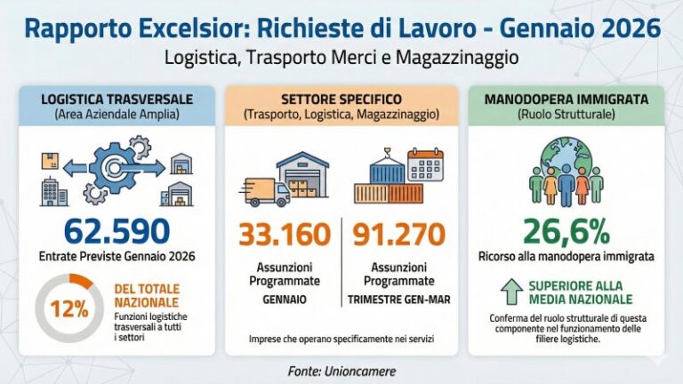 All’interno di questo quadro nazionale, il comparto della logistica, del trasporto merci e del magazzinaggio si conferma uno dei principali motori occupazionali. Considerando l’area aziendale della logistica in senso ampio, che include le funzioni logistiche trasversali a tutti i settori economici, le entrate previste per gennaio 2026 sono 62.590, pari al 12% del totale nazionale. Se si restringe l’analisi alle imprese che operano specificamente nei servizi di trasporto, logistica e magazzinaggio, le assunzioni programmate sono 33.160 nel solo mese di gennaio e 91.270 nel trimestre gennaio-marzo. In questo segmento si rileva un ricorso alla manodopera immigrata superiore alla media nazionale, pari al 26,6%, a conferma del ruolo strutturale di questa componente nel funzionamento delle filiere logistiche.