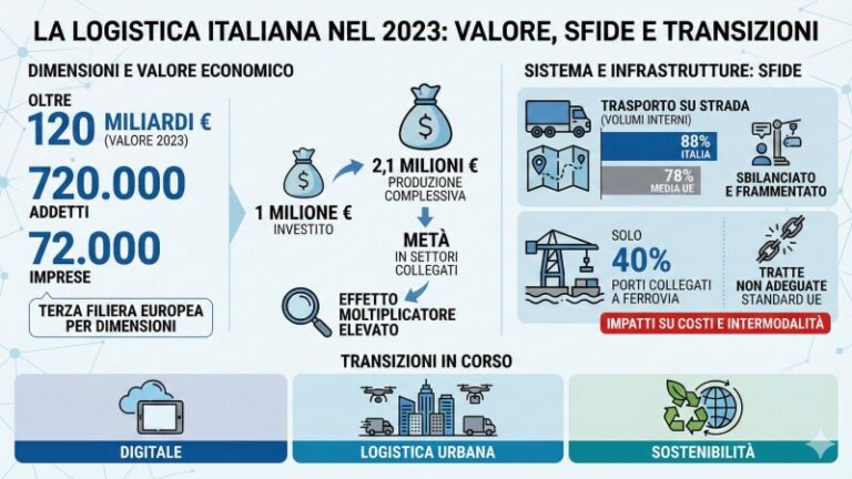 - La logistica italiana vale oltre 120 miliardi di euro nel 2023 e impiega 720mila addetti in 72mila imprese. È la terza filiera europea per dimensioni, con un effetto moltiplicatore elevato: un milione di euro investito genera 2,1 milioni di euro di produzione complessiva, metà dei quali in settori collegati.