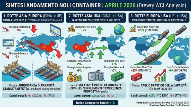 I noli medi spot del trasporto marittimo di container diffusi da Drewry il 9 aprile 2026 mostrano un andamento settimanale a due velocità. L’indice composito World Container Index registra un lieve aumento dell’1%, attestandosi a 2.309 dollari per container da 40 piedi, ma questo valore medio tra tutte le rotte considerate nasconde dinamiche divergenti tra le principali rotte. A incidere sono le tensioni geopolitiche legate allo Stretto di Hormuz, la volatilità del costo del carburante e le strategie di gestione della capacità da parte dei vettori, con effetti diretti sui flussi tra Asia, Europa e Stati Uniti.
