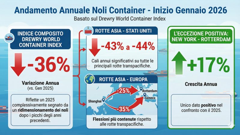 Se l’analisi settimanale evidenzia una ripresa repentina a inizio 2026, il confronto su base annua restituisce un quadro diverso. L’indice composito Drewry World Container Index risulta inferiore del 36% rispetto allo stesso periodo dell’anno precedente, riflettendo un 2025 complessivamente segnato da un ridimensionamento dei noli dopo i picchi degli anni precedenti. Le principali rotte Asia-Stati Uniti mostrano cali annui compresi tra il 43% e il 44%, mentre le tratte Asia-Europa registrano flessioni più contenute, come il -25% su Shanghai-Genova e il -35% su Shanghai-Rotterdam. Fa eccezione la rotta New York-Rotterdam, che su base annua evidenzia una crescita del 17%, unico dato positivo nel confronto con il 2025.