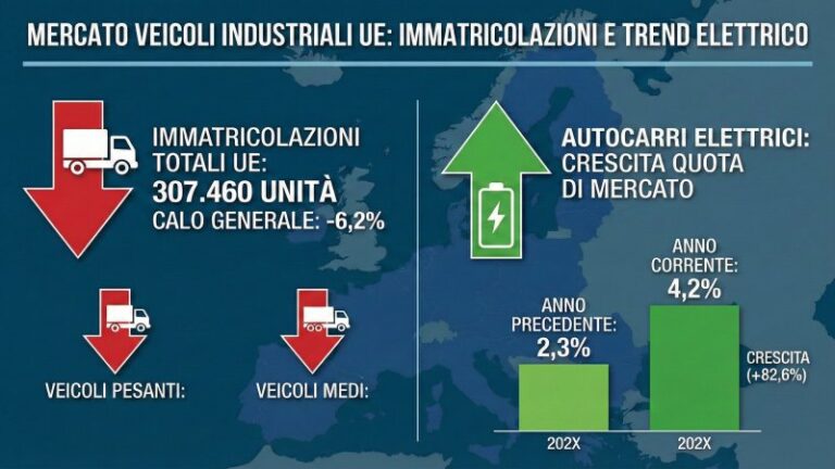 Nel segmento dei veicoli industriali, le nuove immatricolazioni nell’Unione Europea sono diminuite del 6,2%, per un totale di 307.460 unità. La flessione è stata determinata dal calo del 5,4% nei veicoli pesanti e da una riduzione ancora più accentuata nella fascia dei medi (-9,9%). Tutti i principali mercati hanno registrato segni negativi: la Germania ha chiuso con un meno 12,2%, la Francia con un meno 9% e la Spagna con un meno 3,6%.