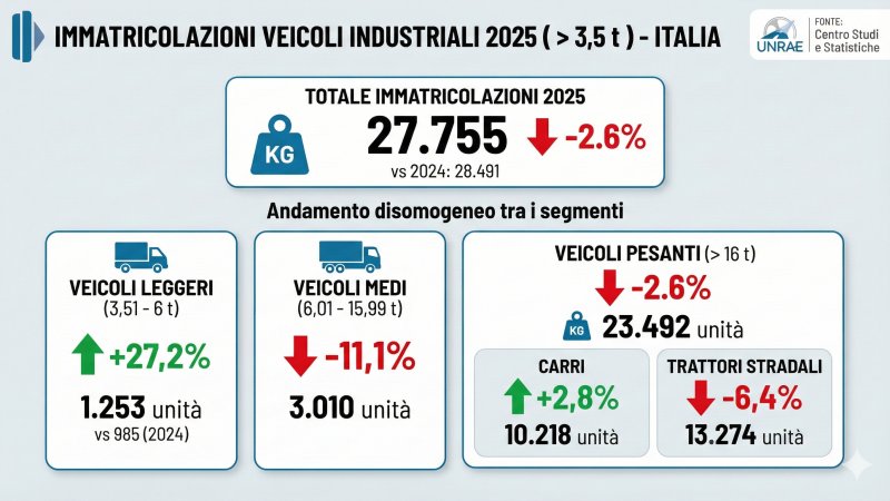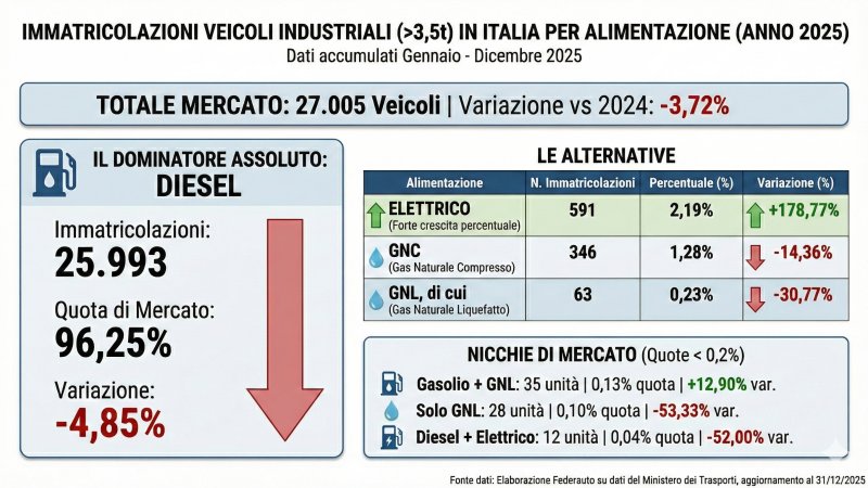 Il mercato italiano dei veicoli industriali sopra le 3,5 tonnellate di peso totale a terra ha chiuso il 2025 con un segno negativo e con un assetto tecnologico sostanzialmente immutato. Secondo l’elaborazione di Federauto (associazione dei venditori di autoveicoli) su dati del ministero dei Trasporti, nel corso dell’anno sono state immatricolate 27.005 unità, in diminuzione del 3,72% rispetto alle 28.049 del 2024. Un risultato che conferma una fase di debolezza strutturale del comparto pesante, in un contesto operativo e regolatorio sempre più complesso. L’analisi delle vendite evidenzia una crescente distanza tra gli obiettivi normativi europei in materia di riduzione delle emissioni di CO2 e la realtà operativa del trasporto pesante, caratterizzata da esigenze stringenti di autonomia, costi di esercizio e continuità dei tempi di lavoro.