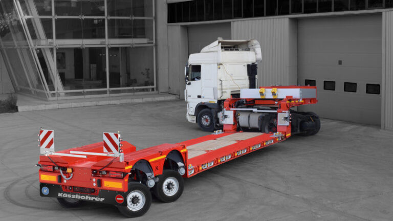 La flessibilità dimensionale è un altro elemento importante della nuova culla. Il sermirimorchio K.Sll P può estendersi orizzontalmente fino a 5.550 millimetri e lateralmente fino a 2 x 230 millimetri. Questa configurazione permette di accogliere carichi di natura diversa, tra cui macchine da costruzione, silos agricoli e industriali, componenti in acciaio, elementi per costruzioni industriali e imbarcazioni. La piattaforma di carico ribassata è progettata per agevolare il trasporto di elementi voluminosi. Kässbohrer indica un’altezza di carico di 350 millimetri, che consente di trasportare merci alte fino a 3.650 millimetri senza lavorazioni o procedure aggiuntive.