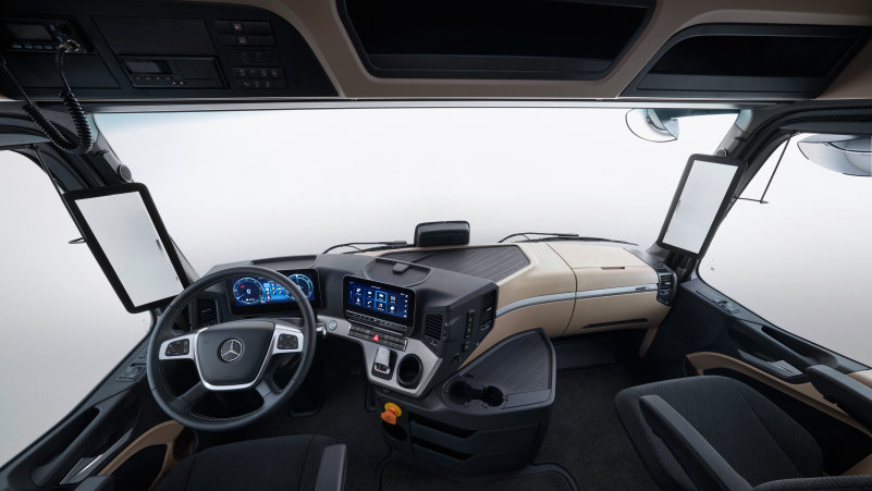 La cabina dell’eActros è stata allungata di 80 millimetri rispetto a quella dell’Actros diesel, applicando la nuova normativa europea che permette di farlo per aumentare l’aerodinamica e la sicurezza. Questo miglioramento aerodinamico contribuisce ad aumentare l’autonomia.