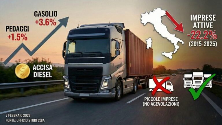 L’avvio del 2026 si è rivelato molto gravoso per l’autotrasporto. Secondo il rapporto dell’Ufficio Studi della Cgia, diffuso il 7 febbraio 2026, l’aumento dei pedaggi autostradali, pari a circa il 1,5 percento, e quello del gasolio per autotrazione, cresciuto del 3,6 percento tra la fine del 2025 e l’inizio dell’anno, hanno determinato un deciso incremento dei costi fissi per le imprese. Si tratta di rincari che interessano l’intero comparto, ma che risultano particolarmente penalizzanti per le realtà di dimensioni più contenute.